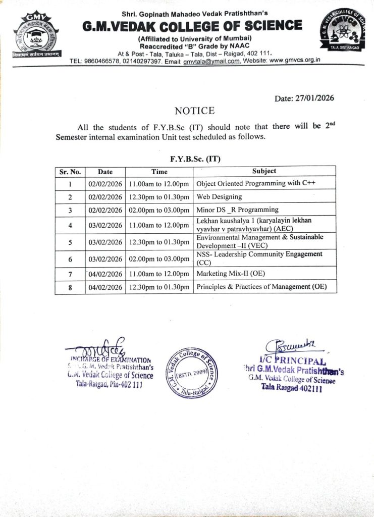 F.Y.B.Sc (IT) Semester II Unit Test Time Table